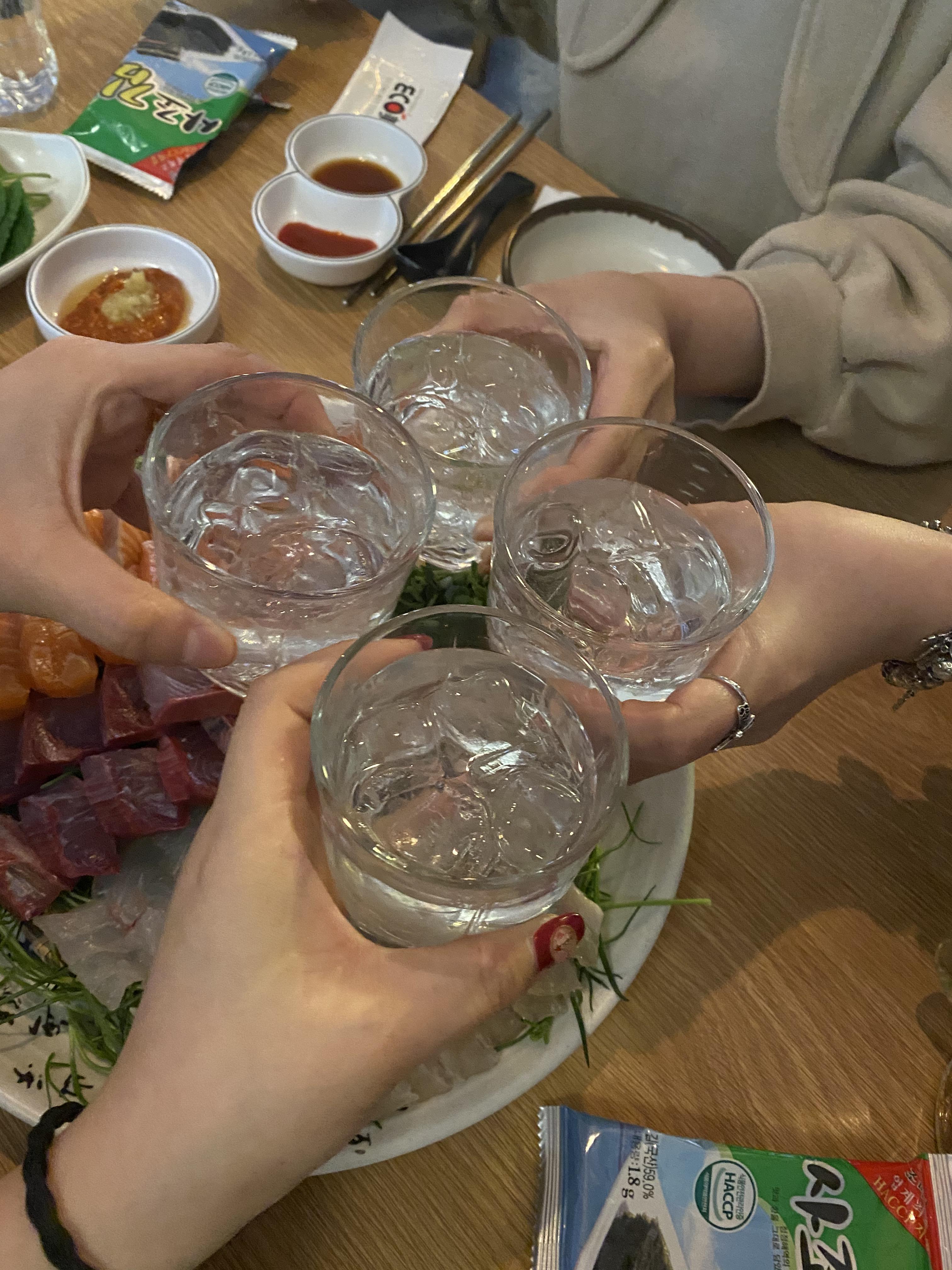 오늘의 하이라이트! 방어, 언어, 광어가 나왔습니다. 아.. 이 영롱한 회들의 때깔을 보세요. 나오자마자 우리도 모르게 다같이 "대박!" 을 외쳤습니다. 맛 표현을 맛깔나게 못하는 히또리가 한스럽습니다. 정말 윤기 좔좔.. 침 꼴깍.. 이렇게 맛있는 음식을 먹을 땐 술이 빠질 수 없지요! 오늘은 신년회 겸 만났으니 질러보자! 생각하며 화요를 주문했습니다. 화요를 주문하면 토닉워터 2병을 공짜로 주더라구요. 얼음 동동 띄어 화요와 토닉워터를 섞어 마시면 캬 꿀주가 되지요. 술이 쭉쭉 들어갑니다. 취하는 지도 모르고 마시기 시작합니다.